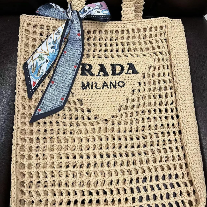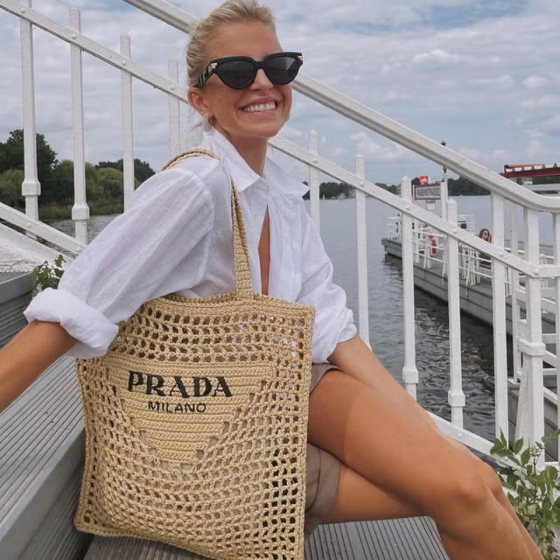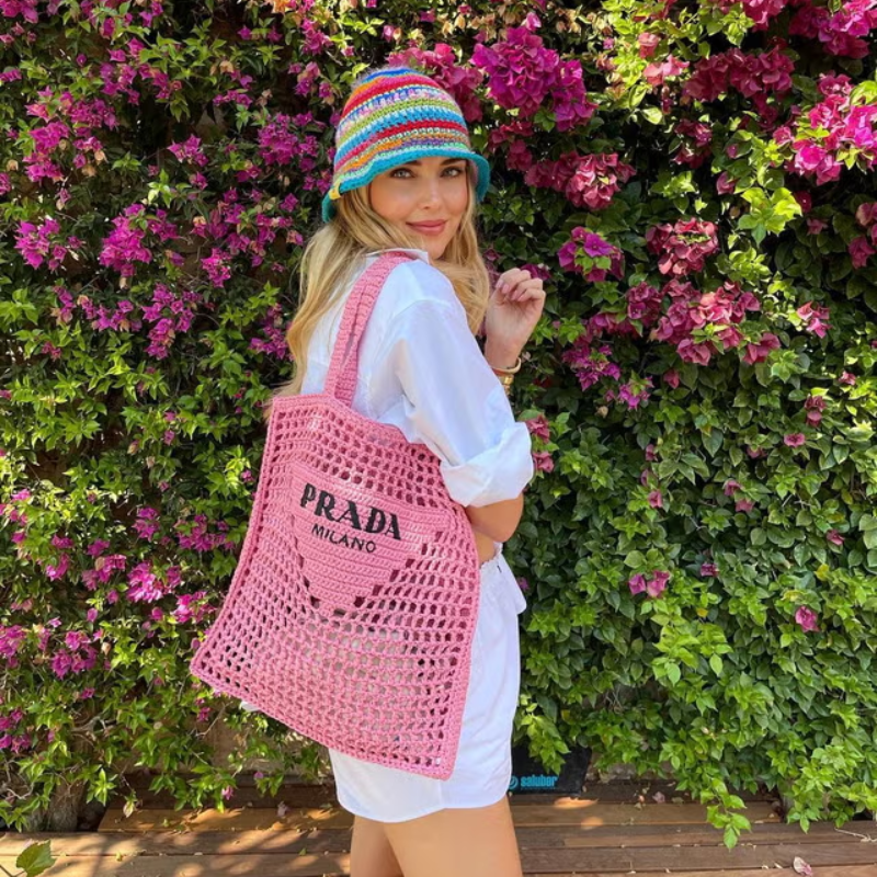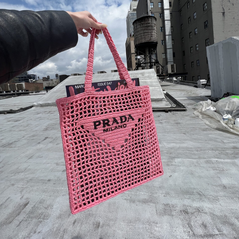 Este bolso tote de crochet presenta una forma suave y deconstruida, con un aire ligero y veraniego. Una nueva interpretación del emblemático triángulo de Prada decora la parte delantera y está adornado en el centro con el logotipo bordado.